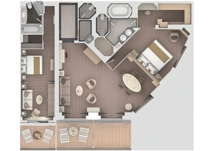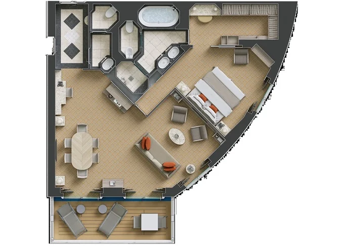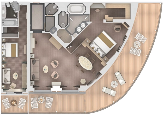 R1 - Royal Suite 1 105 m² (vrátane balkónu). 7. paluba vpredu. Max 3 osoby. 37 800 € 12 600 € za osobu