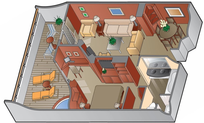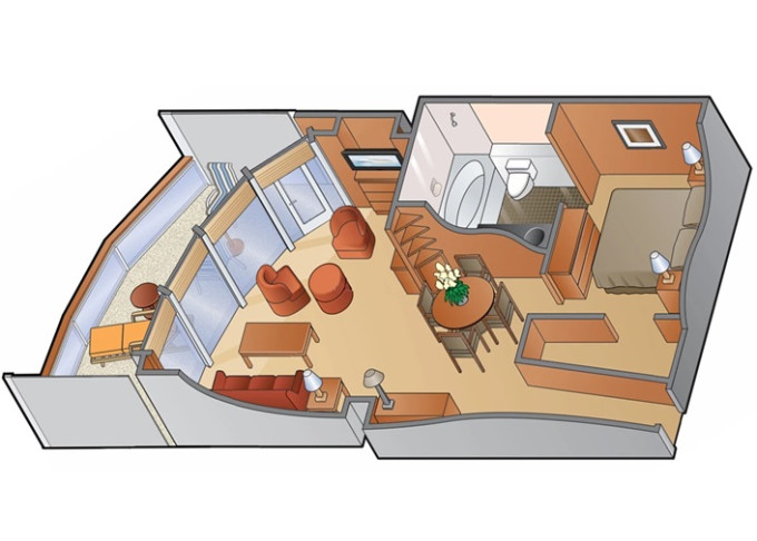 • Kajuty sú umiestnené v blízkosti lodného Spa. K ich vybaveniu patrí posilnený systém vzdušnej filtrácie, posteľ Queen-Size (v kategóriách Edge King-Size), veľké zasúvacie sklenené dvere, exkluzívne posteľné prádlo eXhale®, veľkorysé skladovacie priestory.