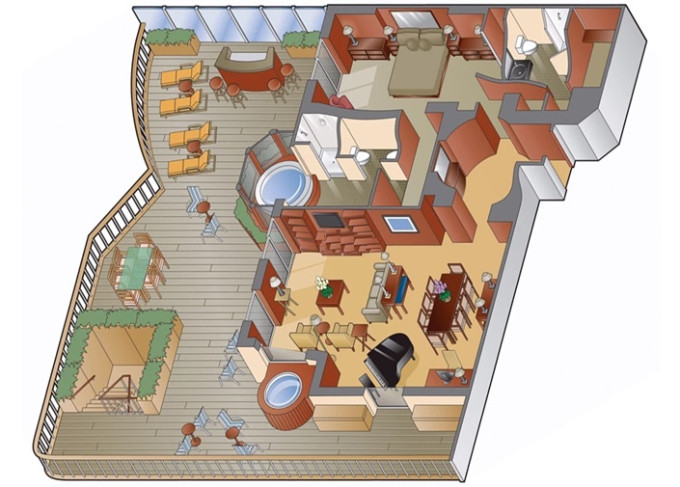 RS - Royal Suite 50 m² + balkón s vírivkou 18 m². Kúpeľňa s vírivkou. 6. paluba vzadu. Max 4 osoby. Výhody Suite The Retreat. 13 287 € 13 287 € za osobu