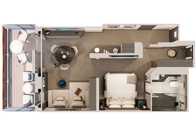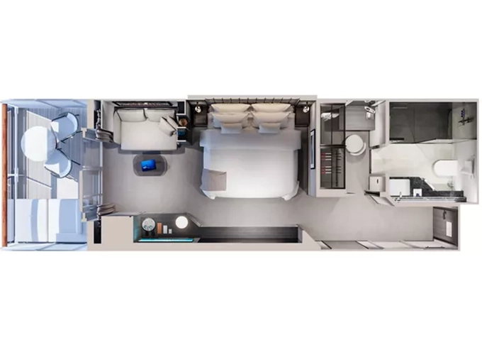 Ocean Residence - Cove Residence Suita + terasa so sedením a lehátkami 56 m². Spálňa s obývacou a jedálenskou časťou, šatník. Koktailová súprava, minibar, kávovar, vodná kanvica, ďalekohľad, sejf, kúpeľňa so sprchou. Závesy, svetlo, klimatizácia ovládané smart technológiou. Taška Technogym Case Kit. Fľaša šampanského na privítanie. Maximálna kapacita 3 osoby. 26 272 € 6 568 € za osobu
