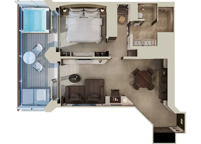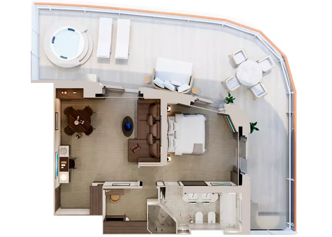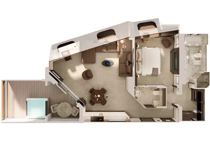 Ocean Residence - Cove Residence s vírivkou Suita + terasa s vírivkou a lehátkami 56 m². Spálňa s obývacou a jedálenskou časťou, šatník. Koktailová súprava, minibar, kávovar, vodná kanvica, ďalekohľad, sejf, kúpeľňa so sprchou. Závesy, svetlo, klimatizácia ovládané smart technológiou. Taška Technogym Case Kit. Fľaša šampanského na privítanie. Maximálna kapacita 3 osoby. 23 732 € 5 933 € za osobu
