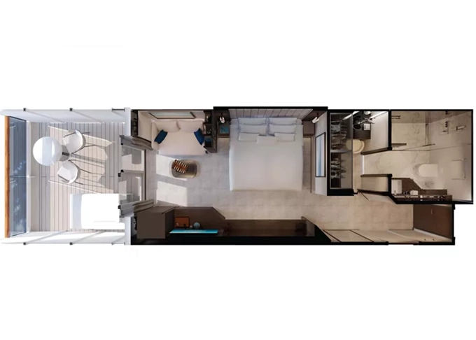 Ocean Residence - Cove Residence Suita + terasa so sedením a lehátkami 56 m². Spálňa s obývacou a jedálenskou časťou, šatník. Koktailová súprava, minibar, kávovar, vodná kanvica, ďalekohľad, sejf, kúpeľňa so sprchou. Závesy, svetlo, klimatizácia ovládané smart technológiou. Taška Technogym Case Kit. Fľaša šampanského na privítanie. Maximálna kapacita 3 osoby. 15 010 € 7 505 € za osobu