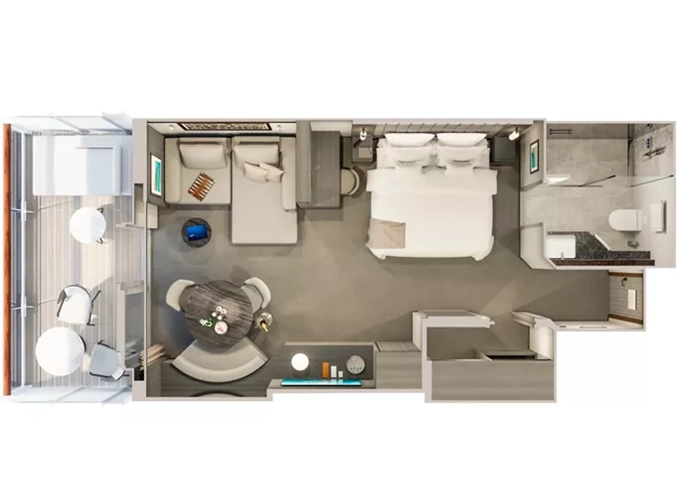 Ocean Suites - Ocean Grand Terrace Suite Suita 28 m² + kúpeľňa 4 m² + terasa so sedením a pohovkou 11 m². 6/7. paluba. Spálňa s obývacou časťou, šatník. Minibar, kávovar, vodná kanvica, ďalekohľad, sejf, kúpeľňa so sprchou. Fľaša šampanského na privítanie. 6, 7. paluba. Maximálna kapacita 2 dospelé osoby + 1 dieťa do nedovŕšených 18 rokov. 9 690 € 4 845 € za osobu