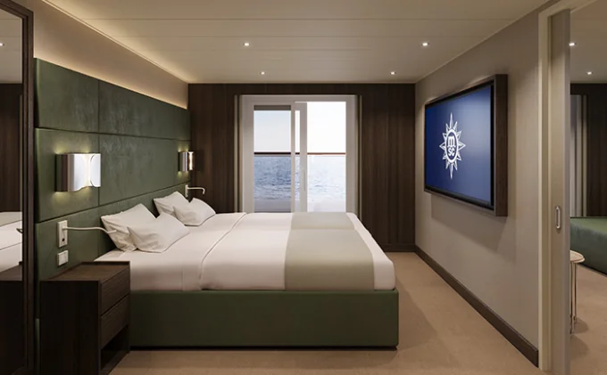 Suite s balkónom: cca31m², kajuta s manželskou posteľou (na požiadanie 2 oddelené postele) a rozkladacia pohovka. Klimatizácia, kúpeľňa s vaňou, toaletný stolík, priestorná skriňa, interaktívna TV, telefón, minibar, sejf, sušič na vlasy. Balkón so stolíkom a stoličkami. Internetové pripojenie (za poplatok).