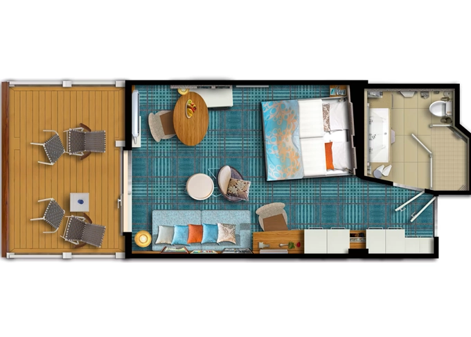 | BAHO - Kajuta s balkónom kat. H / obmedzený výhľad 17 m² + balkón 5 m² s obmedzeným výhľadom. 6-9. paluba. Max 3 osoby. | 2 898 € 1 449 € za osobu |